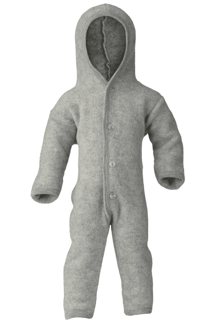 Hooded overall with wooden buttons. Gorgeous organic wool fleece. Made in Germany.